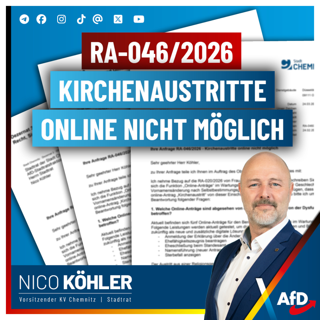 Sehr geehrter Herr Köhler, zu Ihrer Anfrage teile ich Ihnen im Auftrag des Oberbürgermeisters Folgendes mit: Ich nehme Bezug auf die RA-020/2026 von Frau Dr. Zabel. In Ihrer Antwort schreiben Sie, dass… Ihre Anfrage RA-046/2026 – Kirchenaustritte online nicht möglich weiterlesen - Ihre Anfrage RA-035/2026 – Bezahlkarte für Asylbewerberleistungen