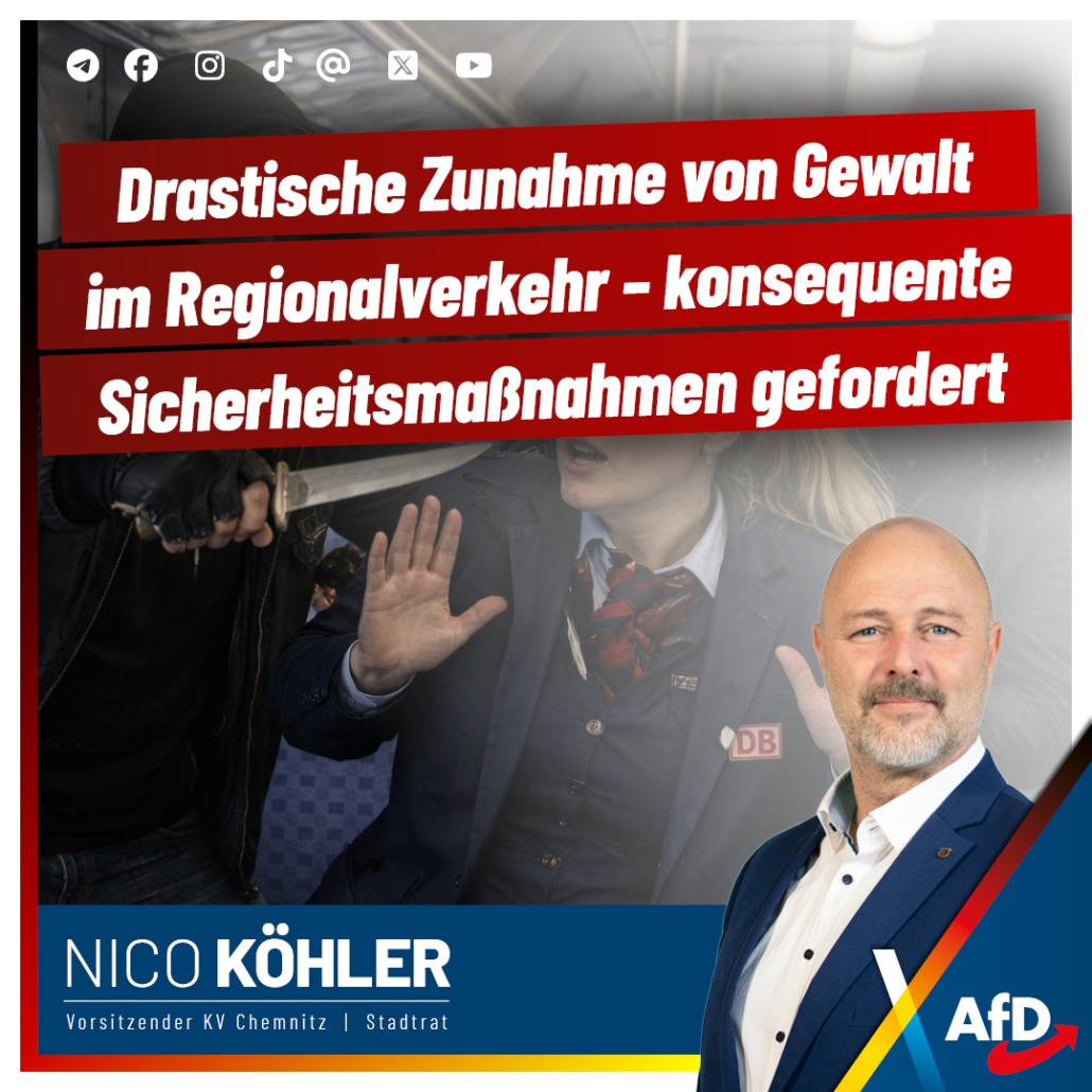 Anlässlich der Veröffentlichung der polizeilichen Kriminalstatistik (PKS) 2025 durch die Polizeidirektion Chemnitz äußert sich Nico Köhler, Kreisvorsitzender der AfD Chemnitz und Fraktionsvorsitzender im Stadtrat, mit deutlicher Kritik und klaren Forderungen. Bereits im… Kriminalstatistik 2025: Sicherheitslage in Chemnitz ernst nehmen – Konsequenzen jetzt ziehen weiterlesen - Drastische Zunahme von Gewalt im Regionalverkehr – konsequente Sicherheitsmaßnahmen gefordert