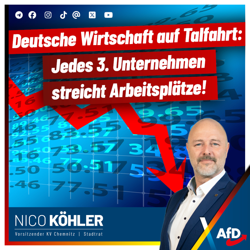 Die Entscheidung des Bundeshaushaltsausschusses im Rahmen des Programms „Sanierung kommunaler Sportstätten (SKS)“ ist ein weiteres Beispiel dafür, wie massiv der Bedarf in den Kommunen und wie unzureichend die tatsächliche Förderung ausfällt. Von… Kein Geld für Chemnitz aus der „Sportmilliarde“ des Bundes weiterlesen - Deutsche Wirtschaft auf Talfahrt: Jedes 3. Unternehmen streicht Arbeitsplätze!
