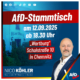 - AfD Stammtisch am 12. September 2025Ich lade Euch zusammen mit meinem stellv. Vorsitzenden Ulrich Oehme herzlich zum AfD Stammtisch ein. Ort: Cafe-Restaurant Wartburg, Schulstraße 10, 09125 Chemnitz Zeit: ab 18.30 Uhr Euer Chemnitzer Stadtrat und AfD Kreisvorsitzender Nico Köhler